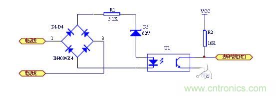 當沒有振鈴信號時,線路上的供電電壓為48V(部分交換機為60V),經四個二極管構成的全橋整流后,不足以使62V穩壓管導通,振鈴信號輸出端電壓接近0V,當振鈴信號到來時,線路上的90V交流振鈴信號經全橋整流變換后90V的脈動直流電,其峰值足以擊穿耐壓值為62V穩壓管,經電阻R1給U1提供電壓,從光電耦合器輸出的波形是 時通時斷的方波方波信號,可以直接輸出至單片機的中斷輸入口, CPU可以根據振鈴信號光電轉換后的高低電平檢測有無振鈴。