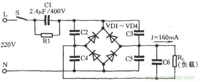 如圖是用電容器代替常用的變壓器,將市電220V降至整流器所需要的交流低電壓電路。在電路中主要由電容器C1降壓,耐壓值為400V;C1的電容量依據(jù)輸出電流確定。在220V/50Hz條件下,電容器C1的取值與輸出電流按下式估算: C=15I 式中:I為輸出電流,單位為A;C的單位為μF。 元件選擇:C1可用紙介金屬膜電容器或紙介油浸電容器,耐壓為400V。為了避免電源斷開(kāi)C1上仍有電荷,所以在C1兩端跨接了一只1MΩ的泄放電阻R1。電容器C2、C3、C4、C5均為消除調(diào)制交流聲和其他高頻干擾而設(shè)置的。C6為濾波電容器,RL為負(fù)載電阻器。