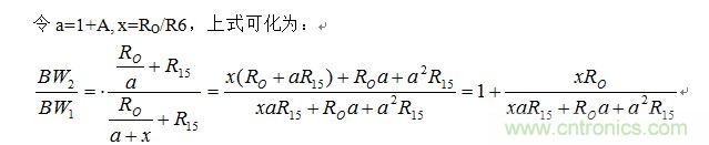 從上式看出,當A較小時,R6的加入確實有擴展帶寬的作用,但R6的取值不能太大。當R6取得很大時,x=R0/R6趨近于0,BW2/BW1趨近于1,也就不能擴展帶寬了。