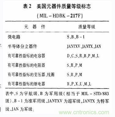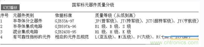 元器件的質量等級是指元器件裝機使用之前,按產品執行標準或供需雙方的技術協議,在制造、檢驗及篩選過程中對其質量的控制等級。質量等級越高,其可靠性等級就越高。