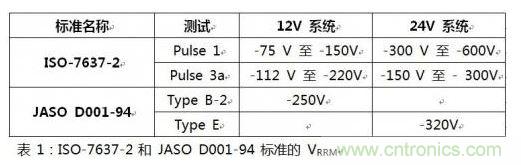 最大重復反向電壓是二極管在反向偏壓模式中能夠承受的最大電壓。在反向偏壓模式中,流過二極管的漏電流會在二極管結中產生熱量并導致熱失控。模擬該條件的測試包括美國的ISO-7637-2 pulse 1和3a以及日本的JASO D001-94標準type B和E.Each,這些測試的峰電壓如下表所示。
