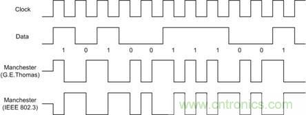 關于單線實現同步傳輸的回答是肯定的,而且這種協議的數量還不少,曼切斯特編碼(Manchester Encoding)就是其中一種,曼切斯特編碼也叫做相位編碼(PE)和雙相碼(Biphase Code)。它的編碼規則是將每個二進制碼元變換成相位不同的一個方波周期。例如,消息碼“0”對應相位,“1”對應相位0。也可以這樣理解,每一位的中間有一跳變,位中間的跳變既作為時鐘信號,又作為數據信號;從高到低跳變表示“0”,從低到高跳變表示“1”,如圖1所示,以Manchester IEEE802.3為準。在傳輸碼元信息的同時,也將時鐘同步信號一起傳輸到對方,每位編碼中有一跳變,不存在直流分量(高電平和低電平電壓相反的情況),因此具有自同步能力和良好的抗干擾性能。小小的不足就是每一個碼元都被調制成兩個電平,所以數據傳輸的速率只有調制速率的1/2。