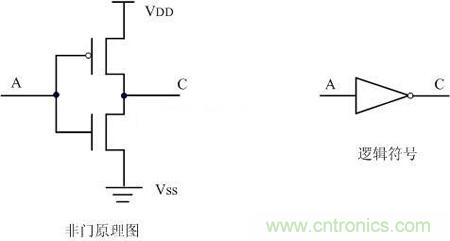 非門(反向器)是最簡單的門電路,由一對CMOS管組成。其工作原理如下: