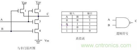 將上述“與非”門、“或非”門邏輯符號的輸出端的小圓圈去掉,就成了“與”門、“或”門的邏輯符號。而實現“與”、“或”功能的電路圖則必須在輸出端加上一個反向器,即加上一對CMOS管,因此,“與”門實際上比“與非”門復雜,延遲時間也長些,這一點在電路設計中要注意。
