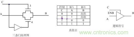 當控制端C為“0”時,3、4管都截止,輸入端A的電平狀況無法到達輸出端B,輸出端B呈現高電阻的狀態,稱為“高阻態”。