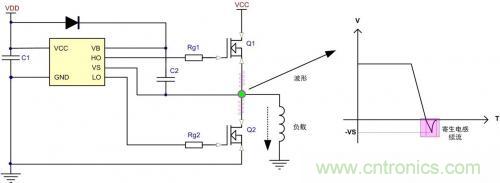 上圖為典型的半橋自舉驅動電路,由于寄生電感的存在,在高端MOS關閉后,低端MOS的體二極管鉗位之前,寄生電感通過低端二極管進行續流,導致VS端產生負壓,且負壓的大小與寄生電感與成正比關系。該負壓會把驅動的電位拉到負電位,導致驅動電路異常,還可能讓自舉電容過充電導致驅動電路或者柵極損壞。由于IC的驅動端通常都有寄生二極管,當瞬間的大電流流過驅動口的二極管時,很可能引發寄生SCR閉鎖效應,導致驅動電路徹底損壞。