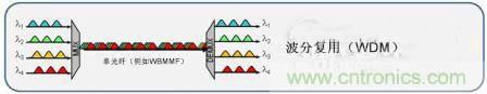 波分復用是通過由不同光的波長(顏色)隔離而成的多個通道上,經復用器匯合和分離而同時發送信號的技術。顧名思義,用于傳輸的波長頻帶被分為多段,每段都能用作通信的信道。將多個信道擠出來作為一個小頻譜是可能的。用于長途、單模系統的常見版本叫做密集波分復用或粗波分復用。在多模系統中,短波分復用技術正在出現。