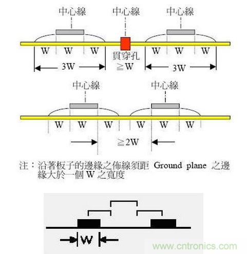 在抑制電路板走線信號串擾方面,有一個非常有名的3W布線規則(其中W就是布線寬度),它的內容是:對于寬度是3W的信號線,如果其他走線的中心和它的中心之間的距離大于3W,就能避免信號之間的串擾。如下圖所示。