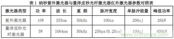 皮秒光纖激光器是在超快激光基礎上開發出的新一代激光器,尤其是近年來光纖器的研制成功,標志著激光技術的一次飛躍進步,與固體納秒激光相比,皮秒光纖激光器具有以下優點:1.激光脈沖寬度更窄,僅為 10^-12S,從上述材料吸收激光能量轉化為熱能的擴散距離公式可知,這將大大減小激光加工材料時的熱擴散距離,降低激光對材料的熱損傷;2.因脈沖寬度變窄,激光單脈沖峰值功率成倍增加,提升了激光加工材料的能力;3.光纖激光器以細小的光纖作為激光的傳輸和放大介質,與固體放大結構相比,不僅工作穩定,免除了周期性的調校工作,降低了維護成本,而且結構小巧,制造成本相對較低。表1是量澤激光公司研制的光纖器與目前市面上主流的納秒級固體紫外激光器的參數對照: