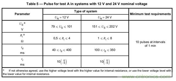 在新的汽車ISO標準中,拋負載測試已經采用ISO-16750-2 (2010) 替代了舊標準 ISO-7637-2 (2004)。 在這2個標準中最大的區別就是新標準要求10分鐘10個波形,而舊的7637-2只是要求測試1次拋負載波形。而測試的Us電壓要求也更嚴格了,從原來的174V限制提高到202V,具體請參考標準中的表格:
