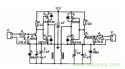 是由兩只p溝道MOSFET。Q1、Q2和兩只n溝道MOSFET Q5、Q6組成。在這里沒有采用4只n溝道MOSFET,原因是驅動電路復雜,如果采用上面的驅動電路接近電源的兩個導體管不能完全導通,發熱量為接近地一側導體管4倍以上,功耗增加,所以采用對管逆變即減小了功耗,而且驅動電路簡單。通過控制4個導體管的開關速度再通過低通濾波器即可實現DC/AC功能。