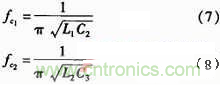 兩個肖特基整流二極管1N5822為續流二極管,這里為防止產生負電壓,C2、C3、C4、C5、L1、L2組成低通濾波器,其中C5、C6為瓷片電容,C2、C3用電解電容,充放電電流可以流進地,L1、L2為帶鐵芯的電感,帶鐵芯的電感對高頻的抑制比空心電感更好,電感值更高。關于參數的選取和截止頻率的計算如下