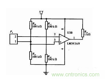由于終端負載一定,所以電流采樣實際等同于一個峰值檢測的過程,此電路實際是一個峰值檢測電路,P3為信號的2個輸入端,調整R10,R11和R17、R18取值來實現峰值測功能,電路中的阻值并不準確,需要實際中根據信號的幅值來調整R10、R11和R17、R18阻值和比值。R14、R15、R19、R20的電流為模擬比較器內部偏置電流的10倍以上,電阻的阻值盡可能大,這樣既減小了功耗也保證了系統的穩定性。Y3采用模擬比較器LM393,LM393內部為開集電極輸出,應用的時候輸出端要接一個上拉電阻,電路如圖3所示。