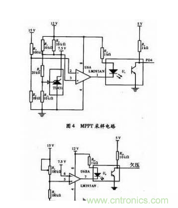 模擬比較器LM393的正相輸入端3腳位固定電壓7.5 V,正常狀態下PD4采集到的為高電平,當2腳的電壓高于7.5 V時輸出端1腳輸出低電平,光耦導通,PD4采集到的為低電平開始處理SPWM信號調整輸出阻抗來實現恒電壓跟蹤,最終實現最大功率點跟蹤。電路如圖4所示。