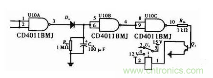 此部分電路的設計采用雙輸入四與非門CD4011做反相器、開關二極管D6、電阻R27、電解電容C10、三極管2N3904和繼電器。R26的選取由繼電器的驅動電流和2N3904的放大倍數β來決定,過小則增加功耗,過大則不能驅動繼電器。R27和C10的放電時間就是系統過流欠壓保護后檢測的間隔時間。時間T=2×R27×C10。
