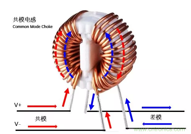 換一個(gè)方式理解:當(dāng)V+上流過一個(gè)頻率的共模干擾,形成的交變磁場,會(huì)在另一個(gè)線圈上形成一個(gè)感應(yīng)電流,根據(jù)左手定則,感應(yīng)電流的方向與V-上共模干擾的方向相反,就抵消了一部分,減小了共模干擾。