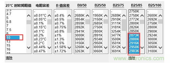 圖3,從Digi-Key網站中很快篩選適當NTC熱敏電阻參數