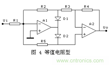 圖5 和 圖6 要求R1=2R2=2R3,增益為1/2,缺點(diǎn)是:當(dāng)輸入信號(hào)正半周時(shí),輸出阻抗比較高,可以在輸出增加增益為2的同相放大器隔離.另外一個(gè)缺點(diǎn)是正半周和負(fù)半周的輸入阻抗不相等,要求輸入信號(hào)的內(nèi)阻忽略不計(jì)。