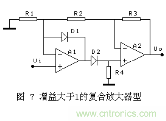 圖7,8,9三種電路,當(dāng)運(yùn)放A1輸出為正時(shí),A1的負(fù)反饋是通過(guò)二極管D2和運(yùn)放A2構(gòu)成的復(fù)合放大器構(gòu)成的,由于兩個(gè)運(yùn)放的復(fù)合(乘積)作用,可能環(huán)路的增益太高,容易產(chǎn)生振蕩。