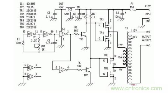 該逆變器使用功率場效應晶體管作為逆變器裝置。用汽車電池供電。因此,在輸入電壓為12伏直流電。輸出電壓是100V的交流電。但是,輸入和輸出電壓不僅限于此。您可以使用任何電壓。他們依賴于變壓器使用。波形輸出為方波。根據經驗,這個電路約100W功率 。