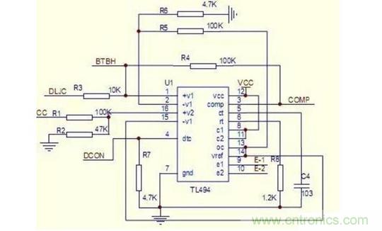 (1)腳第一組放大器的同相輸入端,檢測輸出電流,與3個0.33R 電阻分壓,當電流過大時,分壓電阻上的電壓超過(2)腳基準電壓,(3)腳放大器輸出端輸出高電平,(3)腳為高電平時,電路進入保護狀態。(2)腳為比較器的反相輸入端,接(14)腳基準,作比較器的參考電壓,外部輸入端的控制信號可輸入至腳(4)的截止時間控制端(也叫死區時間控制),與腳(1)、(2)、(15)、(16)誤差放大器的輸入端,其輸入端點的抵補電壓為120mV,其可限制輸出截止時間至最小值,大約為最初鋸齒波周期時間的4%。當13腳的輸出??刂贫私拥貢r,可獲得96%最大工作周期,而當(13)腳接制參考電壓時,可獲得48%最大工作周期。如果我們在第4腳截止時間控制輸入端設定一個固定電壓,其范圍由0V至3.3V之間,則附加的截止時間一定出現在輸出上。 (5)、(6)腳是一個固定頻率的脈沖寬度調制電路,內置了線性鋸齒波振蕩器,振蕩頻率可通過外部的一個電阻和一個電容進行調節,其振蕩頻率如下: