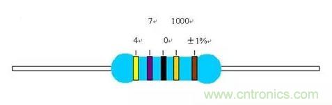 所以,黃色在第一環(huán)就是4,第二環(huán)紫色為7,第三環(huán)黑色是0,第四環(huán)就是乘積了10的3次方也就是1000,第五環(huán)是誤差了棕色為±1%。現(xiàn)在我們來(lái)計(jì)算阻值:470*1000=470K,然后誤差是±1%,所以阻值的范圍是在465.3K—— 474.7K之間,其阻值都是正常的。