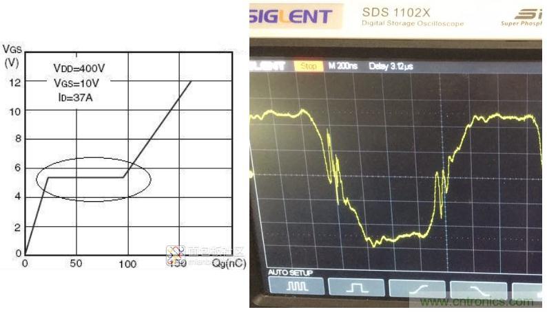有了以上模型,就好辦了,尤其從運放這張圖中,可以一眼看出,這就是一個反相積分電路,當輸入電阻較大時,開關(guān)速度比較緩慢,Cgd這顆積分電容影響不明顯,但是當開關(guān)速度比較高,而且VDD供電電壓表高,比如310V下,通過Cgd的電流比較大,強的積分很容易引起振蕩,這個振蕩叫米勒振蕩。所以Cgd也叫米勒電容,而在MOS管開關(guān)導(dǎo)通或者關(guān)斷的那段時間,也就是積分那段時間,叫米勒平臺,如下圖圓圈中的那部分為米勒平臺,右邊的是振蕩嚴重的米勒振蕩: