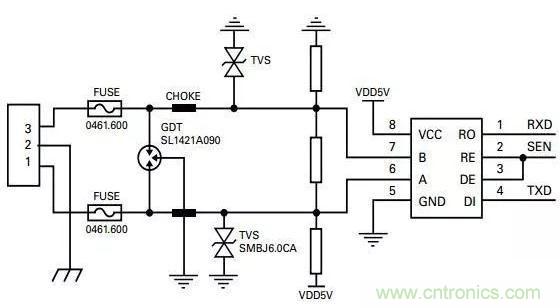 在智能儀表行業里一般采用RS-485通訊。下圖所示為RS-485通訊接口的典型應用。在保護RS-485接口不被靜電或者浪涌損壞通常用SMBJ5.0CA來做接口保護如下圖3所示,當靜電或者浪涌電壓高于5V時,SMBJ5.0CA會開始動作,將電壓鉗位在很低的位置,如果電流超過了峰值電流IPP話,最終電壓會被鉗位在9V左右,從而保護了后一級的器件不被損壞。