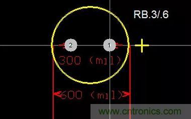 電解電容封裝則以RB標識,常見封裝有:RB.2/.4、RB.3/.6、RB.4/.8、RB.5/1.0,符號中前面數字表示焊盤中心孔間距,后面數字表示外圍尺寸(絲印),單位仍然是英寸,如下圖(RB-.3/.6):