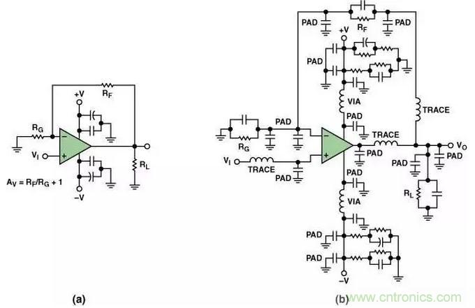 所謂寄生效應就是那些溜進你的PCB并在電路中大施破壞、頭痛令人、原因不明的小故障(按照字面意思)。它們就是滲入高速電路中隱藏的寄生電容和寄生電感。其中包括由封裝引腳和印制線過長形成的寄生電感;焊盤到地、焊盤到電源平面和焊盤到印制線之間形成的寄生電容;通孔之間的相互影響,以及許多其它可能的寄生效應。圖3(a)示出了一個典型的同相運算放大器原理圖。但是,如果考慮寄生效應的話,同樣的電路可能會變成圖3(b)那樣。