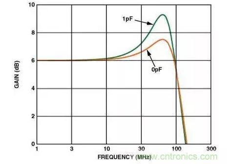 在高速電路中,很小的值就會影響電路的性能。有時候幾十個皮法(pF)的電容就足夠了。相關實例:如果在反相輸入端僅有1 pF的附加寄生電容,它在頻率域可以引起差不多2 dB的尖脈沖(見圖4)。如果寄生電容足夠大的話,它會引起電路的不穩定和振蕩。