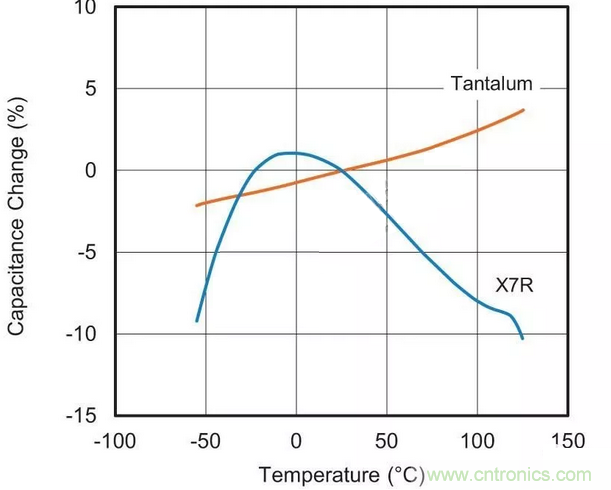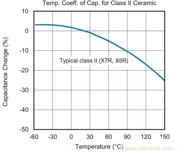 用于替換最可能的MLCC候選者采用“II類”電介質材料。這種II類陶瓷(通常為X7R或X5R)的容值會在溫度范圍內變化,這種特征稱為電容溫度系數(TCC),參見圖1。