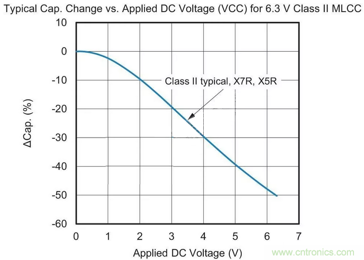 對于典型的X5R組件,溫度范圍為-55°C~+85°C(此范圍±15%)。II類電介質還具有壓電效應(VCC),參見圖2。隨著施加到MLCC的電壓接近額定電壓,電容將顯著下降,這些TCC和VCC特征是附加的,因此,對于工作在+85°C且接近額定電壓的II類組件,電容可能只有指定數據表值的30%。