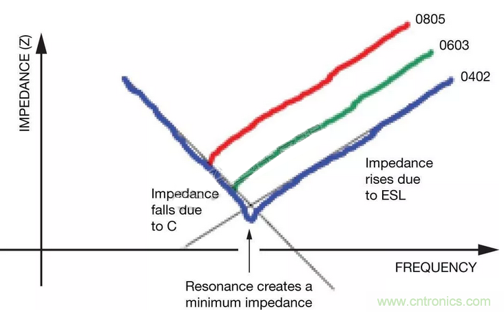 高速電路是一個例外,其中的感應負載可能會延遲傳送來自電容的所需電流,從而影響電路性能。阻抗(Z)的影響因外殼尺寸而有不同,如圖4所示。