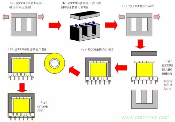 4)鐵心固定方式可以鐵夾(CLIP)或三層膠布方式固定,且可在鐵心接合處點環氧樹脂膠(EPOXY)固定,點膠后須陰干半小時再置于120℃烤箱中烘烤一小時。包鐵心的固定膠布須使用與線包顏色相同的膠布(圖面特殊要求除外),廠家需符合UL規格。組裝過程如圖21所示。