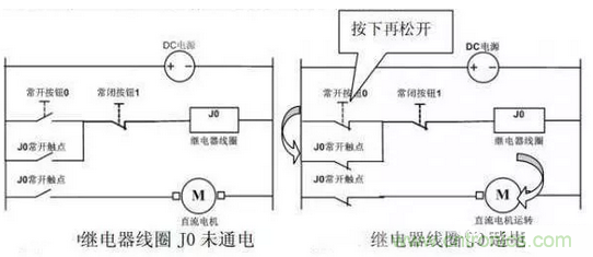 開機 = 按下常開按鈕0 → 繼電器線圈J0得電 → J0常開主觸點閉合 → 電機得電開機、同時J0常開輔助觸點自鎖 → 電機繼續運行,如圖2-8。