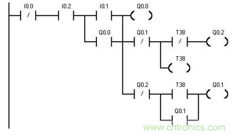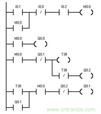 轉換后的梯形圖程序如圖2所示。按照梯形圖語言中的語法規定簡化和修改梯形圖。為了簡化電路,當多個線圈都受某一串并聯電路控制時,可在梯形圖中設置該電路控制的存儲器的位,如M0.0。簡化后的程序如圖3-所示。
