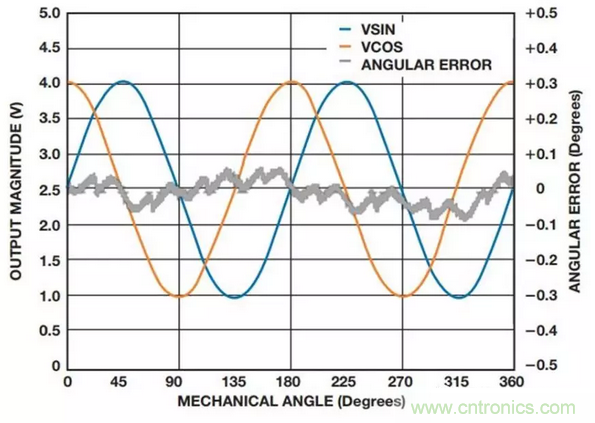 以Analog Devices公司的ADA4571 系列為例,圖2顯示了旋轉磁場施加在360° 機械旋轉情形時ADA4571的典型高輸出電平和角度誤差。經微控制器進行偏移校正后,典型誤差小于0.1°。