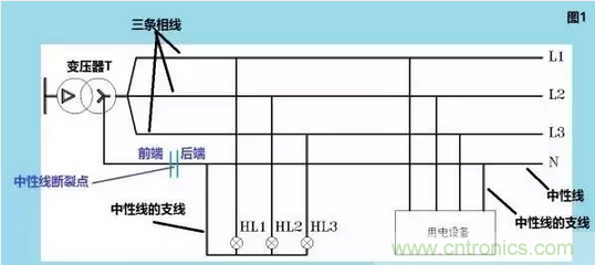 我們再來看圖1。圖1中的中性線發生了斷裂,于是在斷裂點的前方,中性線的電壓依舊為零,但斷裂點的后方若三相平衡時,它的電壓為零;但若三相不平衡,則斷裂點后方的中性線電壓會上升,最高會升到相電壓。