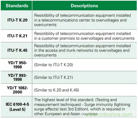 盡管客戶駐地設(shè)備(CPE)設(shè)計(jì)人員可采取三種基本的電路保護(hù)方案:氣體放電管(GDT)、瞬態(tài)電壓抑制(TVS)二極管陣列和保護(hù)型晶閘管,但他們所選擇的任何設(shè)備都必須使其設(shè)計(jì)最小程度地符合浪涌TIA-968B(以前稱為FCC第68部分)的要求。在美國,任何連接到公共交換電話網(wǎng)絡(luò)(PSTN)的通信設(shè)備均需具備此性能。其他國家也有類似要求,如表1所示。一些G.FAST供應(yīng)商可能會(huì)傾向于在美國市場采用符合GR-1089-Core的安全設(shè)計(jì)。