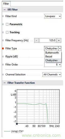 有三種IIR濾波器可供選擇,分別為切比雪夫I型、貝塞爾以及巴特沃斯濾波器。對于不同類型的濾波器可自定義參數(shù)。比如對于巴特沃斯濾波器需要定義截止頻率和濾波器階數(shù),如果是帶通或者帶阻,還需要確定通帶/阻帶帶寬;如果是切比雪夫?yàn)V波器的話,還需要確定波動(dòng)值。