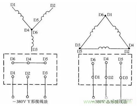 一般常用三相交流電動機接線架上都引出6個接線柱,當電動機銘牌上標為Y形接法時,D6、D4、D5相連接,D1~D3接電源;為△形接法時,D6與D1連接,D4與D2連接,D5與D3連接,然后D1~D3接電源。可參見圖1所示連接方法連接。