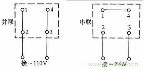 有的單相吹風機引出4個接線端子,接線方法如圖5所示。采用并聯接法應接入110V交流電源,采用串聯接法應接入220V交流電源。