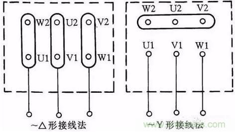 目前,Y系列電動機被廣泛應用。Y系列電動機具有體積小、外形美觀、節電等優點。它的接線方式有兩種:一種為△形,它的接線端子W2與U1相連,U2與V1相連,V2與W1相連,然后接電源;另一種為Y形,接線端子W2、U2、V2相連接,其余3個接線端子U1、V1、W1接電源。接線見圖6。