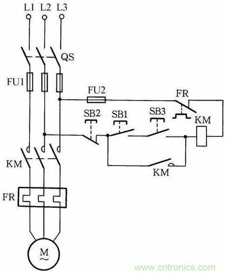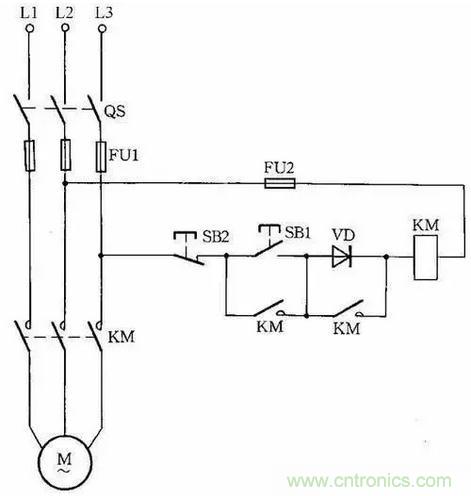 圖中SB2為停止按鈕,在停止時,按動SB2的時間要長一點。否則,手松開按鈕后,接觸器又吸合,使電動機繼續運行。這是因為電源電壓雖被切斷,但由于慣性的作用,電動機轉子仍然轉動,其定子繞組會產生感應電動勢,一旦停止按鈕很快復位,感應電動勢直接加在接觸器線圈上,使其再次吸合,電動機繼續運轉。