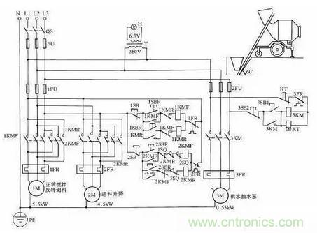 這時料斗已升到預定位置,把料自動倒到攪拌機內,并自動停止上升。此時操作人員按下下降按鈕2SBR時,卷揚系統帶動料斗下降,待下降到其料口與地面平齊時,擋鐵碰撞行程開關3SQ,使2KMR接觸器斷電釋放,自動停止下降,為下次上料做好準備,這時攪拌機料已備好,操作人員再按下3SB1,3KM接觸器得電吸合,使供水抽水泵電動機3M運轉,向攪拌機內供水,與此同時,時間繼電器KT得電工作,待供水與原料成比例后(供水時間由KT時間繼電器調整確定,根據原料與水的配比確定),KT動作延時結束,從而使3KM自動釋放,供水停止。