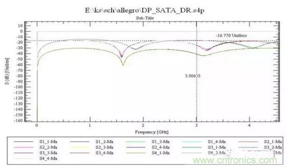 以上的相關步驟設置好以后就可以進行仿真了,allegro可以進行信號的反射仿真、串擾仿真,差分線還要進行眼圖分析。當然仿真也分前仿真和后仿真,在利用allegro進行PCB設計的時候還需要結合仿真的結果實時的對設計進行修改以達到符合要求的目的。由于仿真過程復雜,步驟繁瑣,在此不一一進行描述, 差分對的布線有兩點要注意,一是兩條線的長度要盡量一樣長,等長是為了保證兩個差分信號時刻保持相反極性,減少共模分量。另一是兩線的間距(此間距由差分阻抗決定)要一直保持不變,也就是要保持平行。平行的方式有兩種,一為兩條線走在同一走線層(side-by-side),一為兩條線走在上下相鄰兩層(over-under)。一般以前者side-by-side 實現的方式較多。等距則主要是為了保證兩者差分阻抗一致,減少反射。對差分對的布線方式應該要適當的靠近且平行。所謂適當的靠近是因為這間距會影響到差分阻抗(differential impedance)的值, 此值是設計差分對的重要參數。需要平行也是因為要保持差分阻抗的一致性。若兩線忽遠忽近, 差分阻抗就會不一致, 就會影響信號完整性(signal integrity)及時間延遲(timing delay)。從仿真的S參數曲線圖可以分析差分對的差分阻抗(differential impedance),以及信號完整性。下面給出本設計中的關鍵信號仿真波形以供加以說明。 從仿真圖例圖5看到,S11在0-3.0GHz 的頻域范圍內其最劣化的指標為:-16.770db以下 ,S22(粉紅色的曲線)也不劣于-17db。 這說明該差分對的差分阻抗(differential impedance)接近設計指標,信號完整性得到了保證。