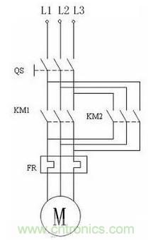 注意看KM1和KM2的相序,當接觸器常開觸點KM1閉合后,接在電動機上的相序是(從左至右)L1,L2,L3;當另一個接觸器的常開觸點KM2閉合后,接在電動機上的相序是(從左至右)L3,L2,L1。上文已經說過了,改變相序就能改變電動機的轉動方向。因此,KM1閉合和KM2閉合,兩次電動機轉動的方向是相反的。