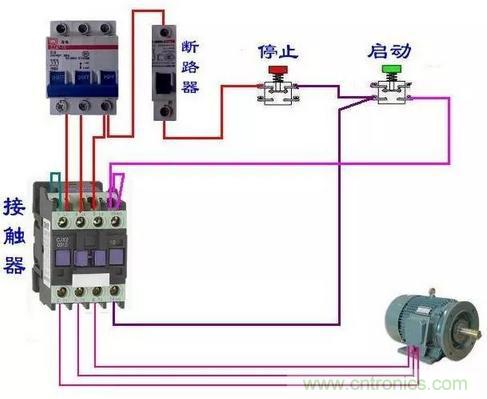上圖是用接觸器控制電機的原理圖,圖1是主回路,圖2是控制回路,圖中黃色框內就是接觸器的主觸點,藍色框內是接觸器的輔助觸點,紅色框內是接觸器的線圈。SB2是起動按鈕,SB1是停止按鈕,當按下SB2時KM1線圈得電吸合,同時藍色框內的KM1輔助觸點也閉合,松開SB2電機照常轉動,按下SB1時電機停止。下圖時交流接觸器接線圖,可以與上圖對照一下。