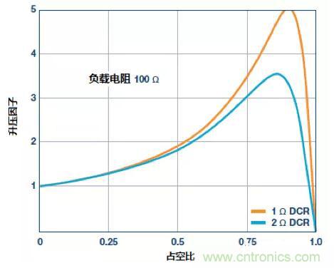 圖2中曲線的變化真實地顯示出輸出端負載電阻和電感的直流電阻的改變,對升壓因子造成的影響。假設負載電阻為100Ω,48V的輸出電壓,這對應于負載電流480mA。當電感的串聯電阻(DCR)只有2Ω,最大升壓因子是有可能剛好超過3; 但對于DCR為1Ω,略高于5的升壓因子是可以實現的。如要求更高的升壓因子,就必須選用具有更低的串聯電阻值的電感。